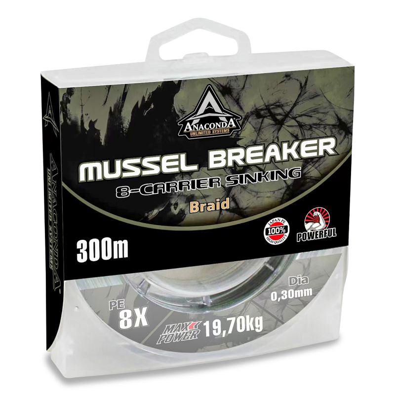 Nová X-8 Carrier Mussel Breaker je potápivá, pletená kaprová šňůra s obzvláště dobrou odolností proti oděru a vysokou pevností v uzlu. Je pevně spletená a zároveň super poddajná. Je tak pevná a odolná proti oděru, že ztráty ryb v důsledku přetržení budou už jen minulostí. Je vhodná jako návazec na spodový prut, ale také pro lov na dlouhé vzdálenosti.