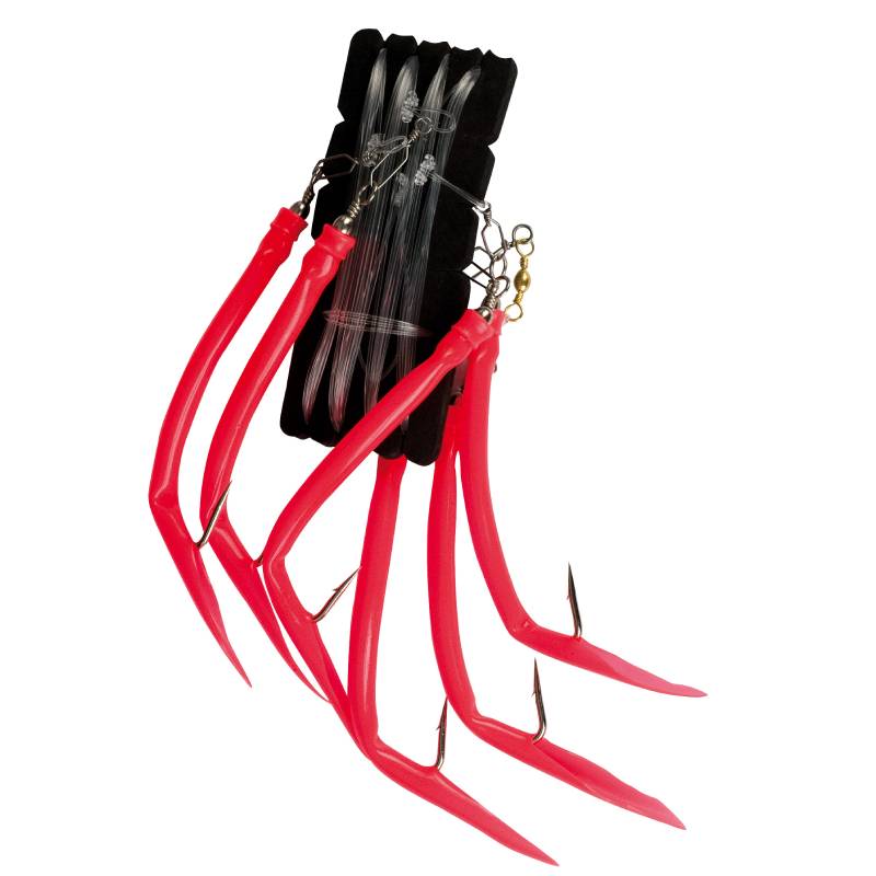 Všechny háčky jsou na karabinkách a dají se snadno vyměnit. Koncovou zátěž doporučujeme od 150 g do 500 g v závislosti na hloubce, síle a proudu vody.